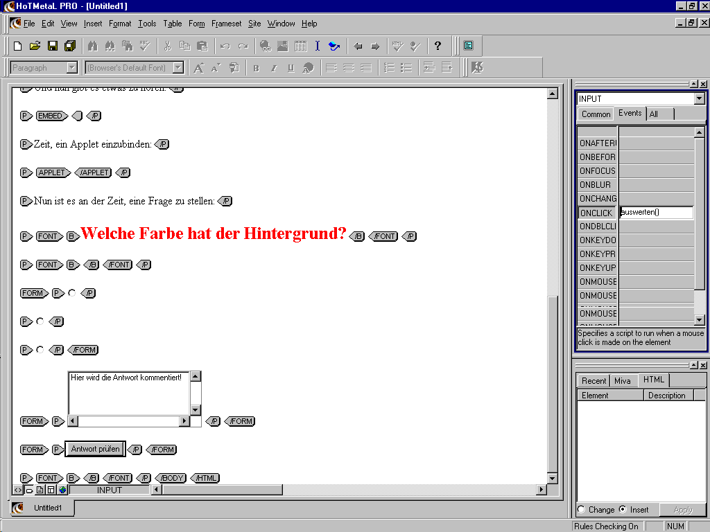 Um die Auswertung starten zu können, wird noch ein Button benötigt. Fügen Sie ihn unterhalb der TextArea ein. (Menü "Form" Befehl "PushButton")![]() Der Button besitzt noch keinen Text. Durch einen Doppelklick auf den Button wird ein Fenster geöffnet, in das Sie bei "Value" als Text "Antwort prüfen" eingeben. Klicken Sie auf "OK". ![]() Damit der Button auch tatsächlich funktioniert, muß er noch mit einem Befehl verbunden werden. Klicken Sie hierzu mit der rechten Maustaste auf den Button. Im erscheinenden Kontextmenü wählen Sie "Attribute Inspector". Dieser wird wieder im Fenster rechts oben angezeigt. Wechseln Sie von der Registerkarte "Common" auf die Registerkarte "Events". Es werden alle verfügbaren EventHandler angezeigt: die Programmiersprache JavaScript, mit deren Hilfe interaktive Elemente auf HTML-Seiten zu Leben erweckt werden, benötigt solche EventHandler zum Aufruf der einzelnen Funktionen. Möglich sind z.B.: ONMOUSEOVER (Wird die Maus über das Objekt bewegt, wird eine Funktion gestartet) oder ONCLICK (wird das Objekt angeklickt, wird eine Funktion ausgelöst). Für unsere Zwecke ist der EventHandler "ONCLICK" zu wählen. Als aufzurufende Funktion geben Sie "auswerten()" an. Diese Funktion wird auf der nächsten Seite noch hinzugefügt. ![]() Weiter geht es auf der nächsten Seite! |