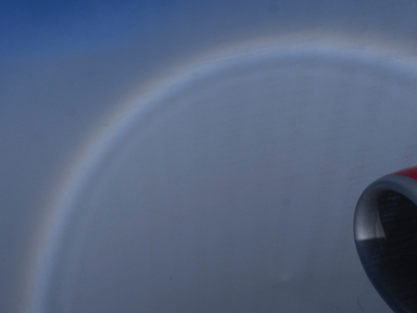 Regenbogen und Glorie treten auf, wenn der Beobachter die Sonne im Rücken hat und der Schatten auf eine "Tropfenwand" trifft. Außerdem muss die Tropfenwand ausreichen ausgedehnt sein, damit man den Regenbogen noch gleichzeitig mit der Glorie sieht. Die Bedingung Schatten des Beobachters auf ausreichend ausgedehnten der Wand sind selten gegeben. Leichter findet man sie vom Flugzeug aus. Das obere Bild zeigt den Schatten des Flugzeugs (des Beobachters) der von einem hellen, kreisrunden Fleck umgeben ist und am Rand den Ausschnitt des Regenbogensystems. Im unteren Bild - aufgenommen mit einer kleineren Brennweite - zeigt mehr vom Regenbogen. Den Schatten des Flugzeugs mit dem weißen Fleck (Glorie) kann man nur noch andeutungsweise erkennen.